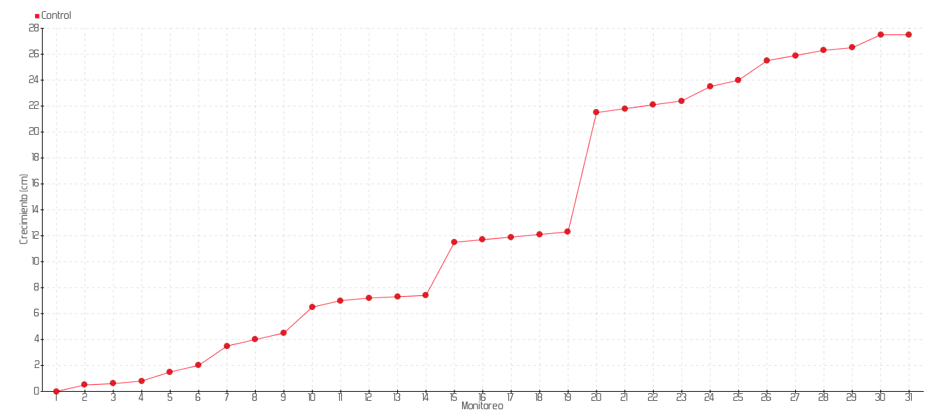 | 28 | 20/01/2014 | 44.80 cm | 0.40 cm | 0.0571 cm/día | 26.30 cm |