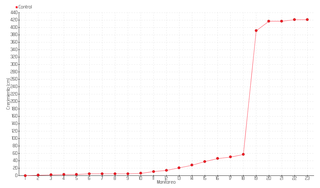 17 | 08/01/2014 | 59.00 cm | 4.00 cm | 0.3077 cm/día | 50.00 cm |