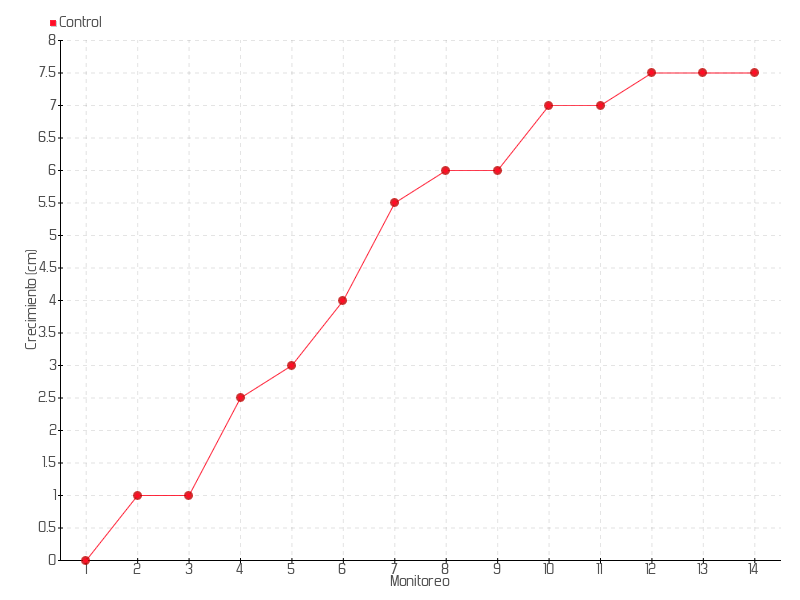 8 | 04/09/2013 | 15.00 cm | 0.50 cm | 0.0357 cm/día | 6.00 cm |